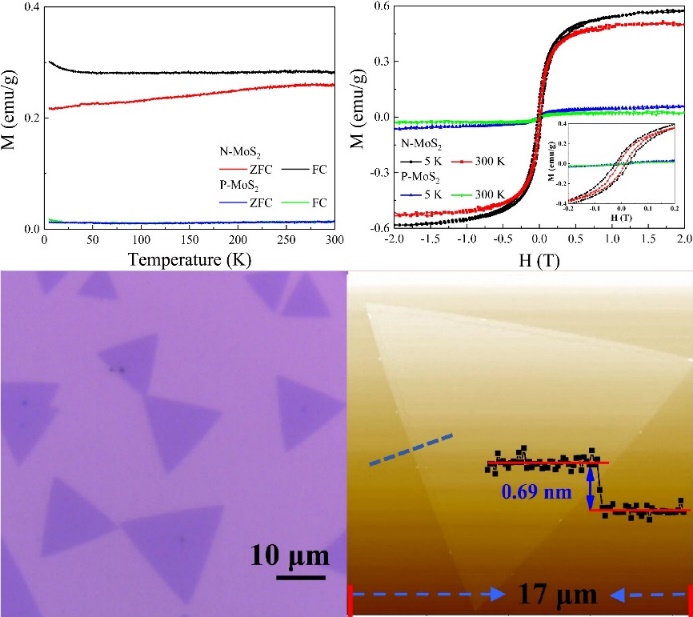 采用原位氮掺杂工艺,利用N-p态、S-p态与Mo-d态的强杂化作用,首次通过非金属原子掺杂,在不破坏材料晶体完整性的前提下,诱导单层二硫化钼薄膜呈现稳定的室温铁磁性。论文发表在Nature Index 期刊Applied Physics Letters, 2020, 116, 073102, 该论文被编辑评选为亮点论文。