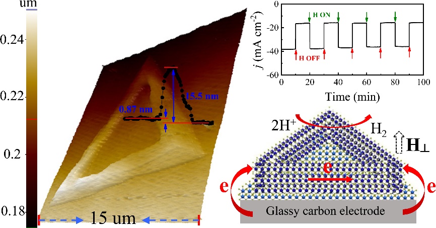 课题组设计并制备了具有室温铁磁特性的碗型二硫化钼纳米片,通过外加垂直物理磁场提高了层间及面内电子传输效率,显著增强了材料的电解水析氢反应性能。论文于近日在线发表在Nature Index 期刊Nano Letters(DOI: 10.1021/acs.nanolett.0c00845)。