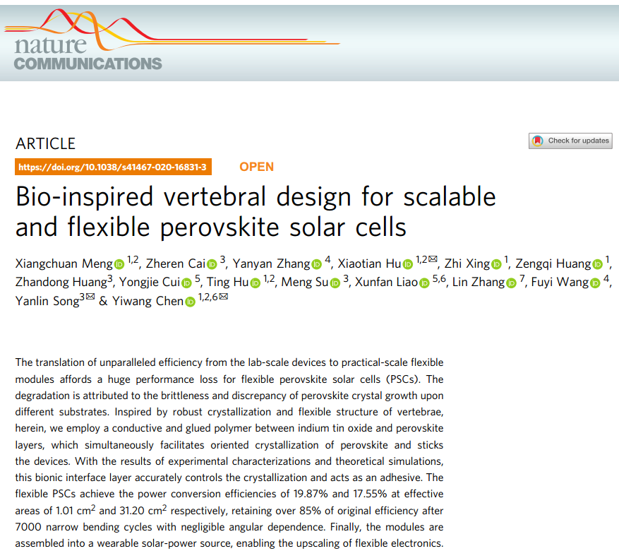 此外,团队成员受到坚硬的脊椎骨骼结晶和柔性结构启发,通过仿生晶界和结构设计,在氧化铟锡透明电极和钙钛矿层之间引入一种导电粘性聚合物界面层。这种仿生界面层可以精确的调控结晶形核过程,并起到界面粘结剂作用,使基于1.01 cm2和31.20 cm2有效面积的柔性钙钛矿太阳电池功率转换效率分别达到了19.87%和17.55%。该性能为目前柔性钙钛矿太阳电池最高效率之一,并经过第三方权威机构认证。此外,电池经过7000次极限弯折半径循环处理后,仍能保持初始效率的85%以上,并克服大角度弯折难题。该研究成果《Bio-inspired vertebral design for scalable and flexible perovskite solar cells》发表在国际综合性顶级期刊《自然-通讯》(Nature Communications)上。