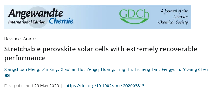团队通过将可机械自修复的聚氨酯材料进一步修饰杂化钙钛矿薄膜晶界,实现多级释放拉伸应力并成功通过原位方法进行证实。基于此,成功制备具有机械自修复功能的可拉伸钙钛矿太阳电池,器件效率达到19.15%。该研究成果《Stretchable perovskite solar cells with extremely recoverable performance》发表在国际化学领域顶级期刊《德国应用化学》(Angewandte Chemie International Edition)上。