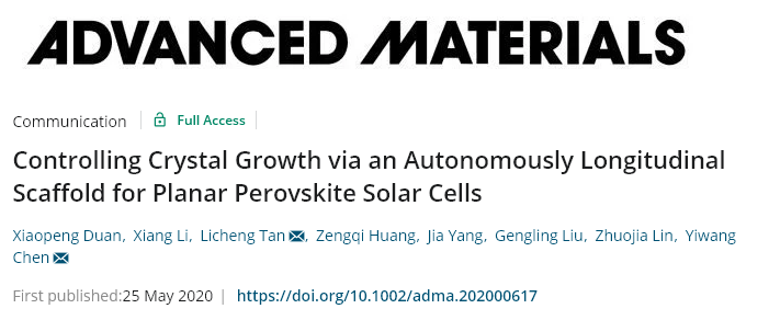 团队仿造爬藤类植物生长原理,开发了一种可以在钙钛矿结晶过程中充当生长模板的自组装纵向聚合物支架,从而有效提高钙钛矿薄膜的质量以及水氧阻隔和机械稳定性,这为钙钛矿材料在柔性基底上实现大面积高质量结晶提供了一种新的思路。该研究成果《Controlling Crystal Growth via Autonomously Longitudinal Scaffold for Planar Perovskite Solar Cells》发表在国际材料领域顶级期刊《先进材料》(Advanced Materials)上。
